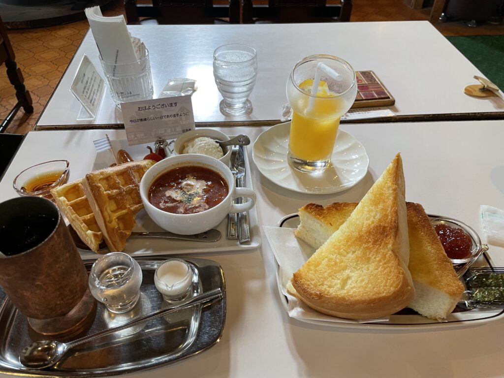 コーヒーのワッフルセットとトースト、オレンジジュースを注文。
